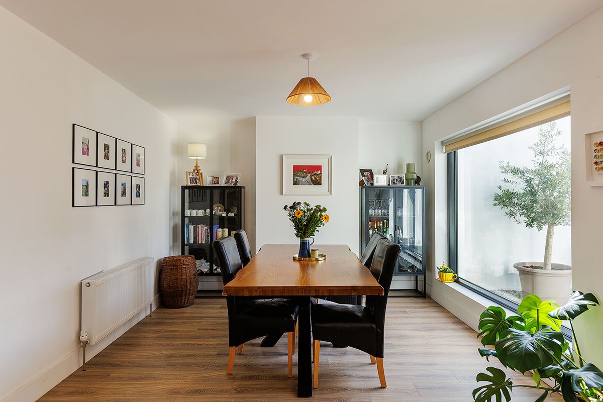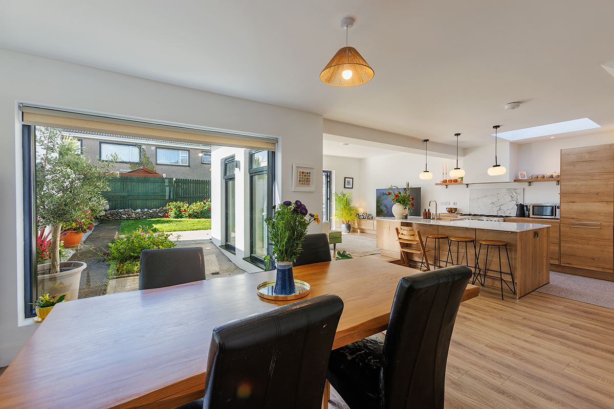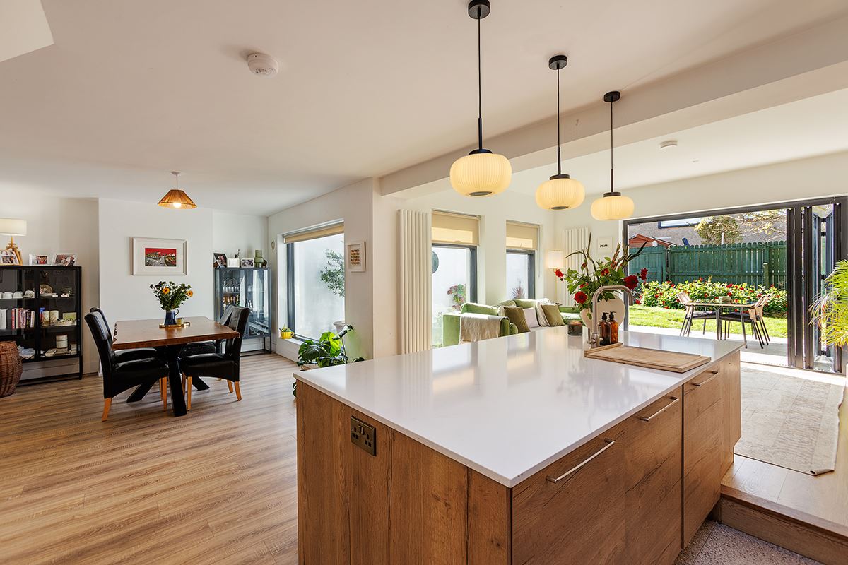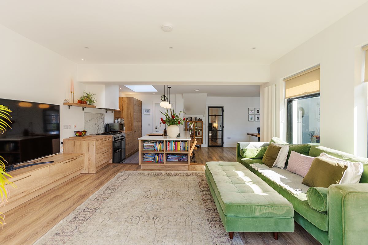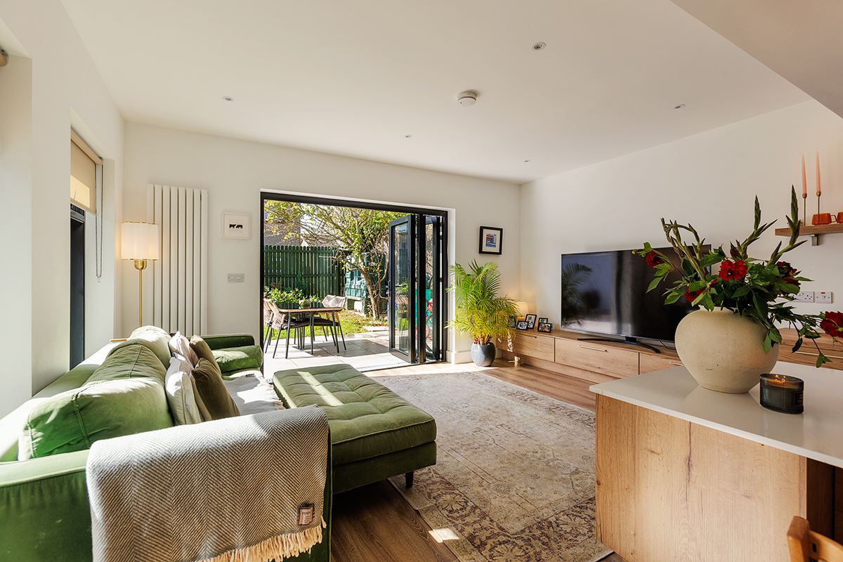 The symmetry and warmth of this open plan space with its vibrant pops of colour, vertical radiators, sleek uPVC black-framed windows, natural wood bespoke cabinetry with horizontal handles, a large central island and integrated seating provided by stylish bar stools, help to create a distinct yet connected living areas downstairs. For moments of quiet escape, a separate lounge to the front of the home mirrors the same impeccable style, offering a cosy retreat.