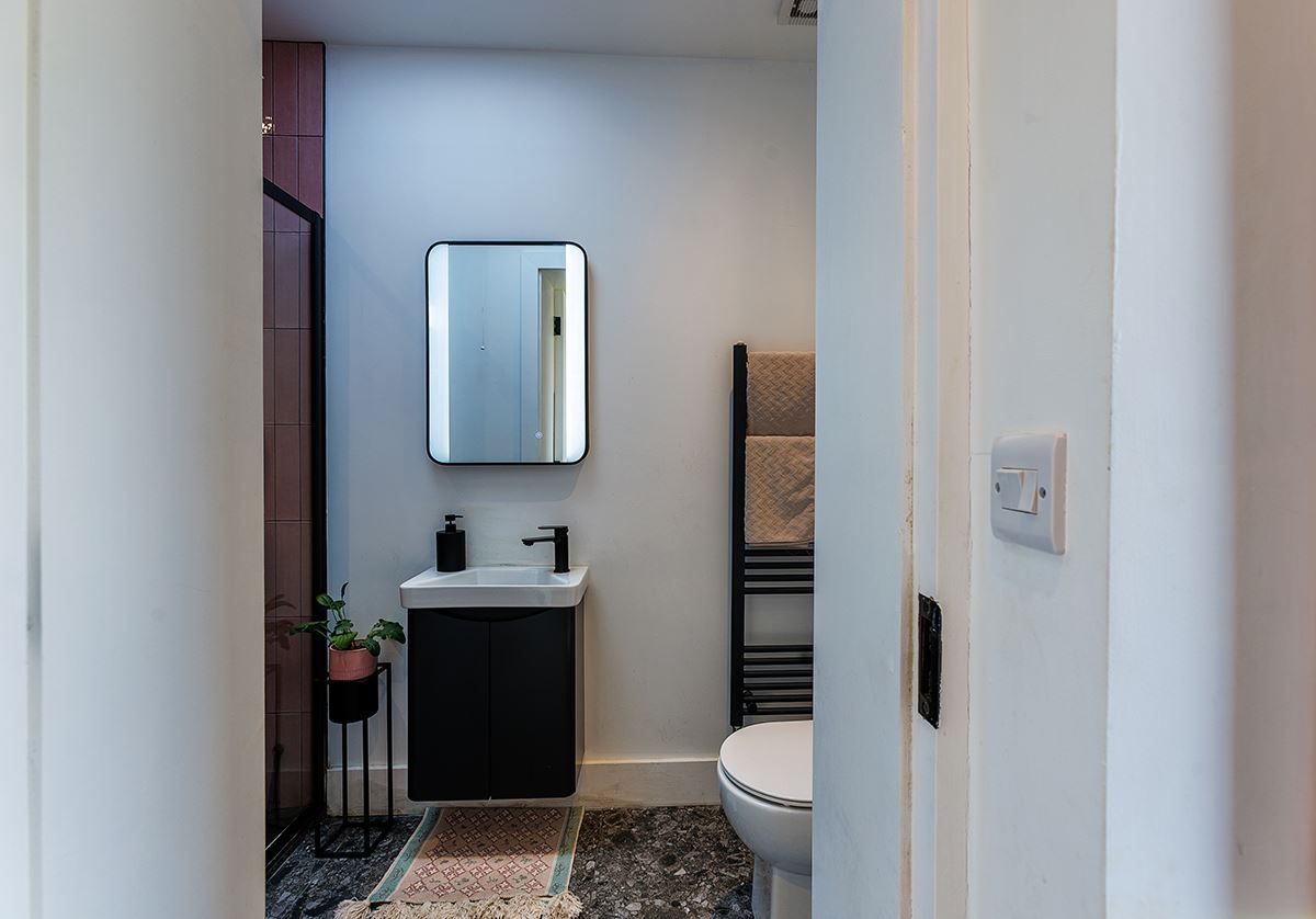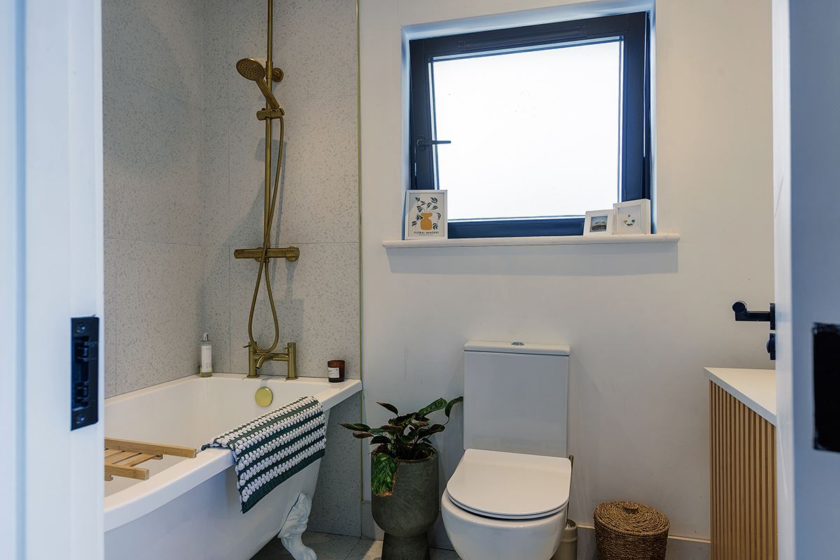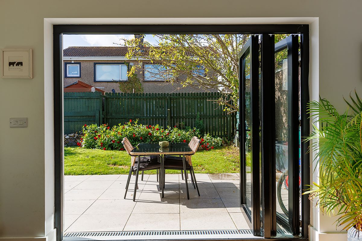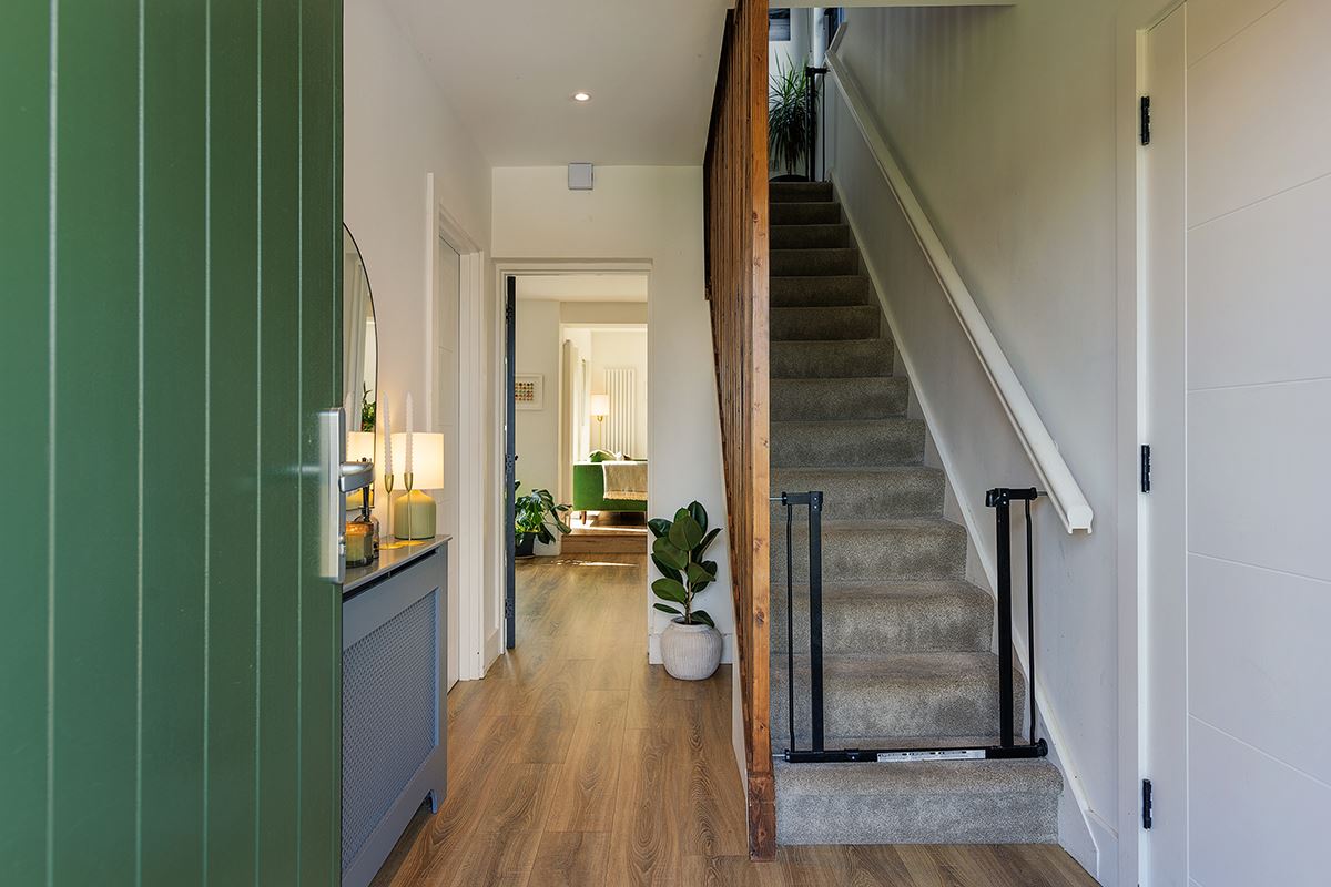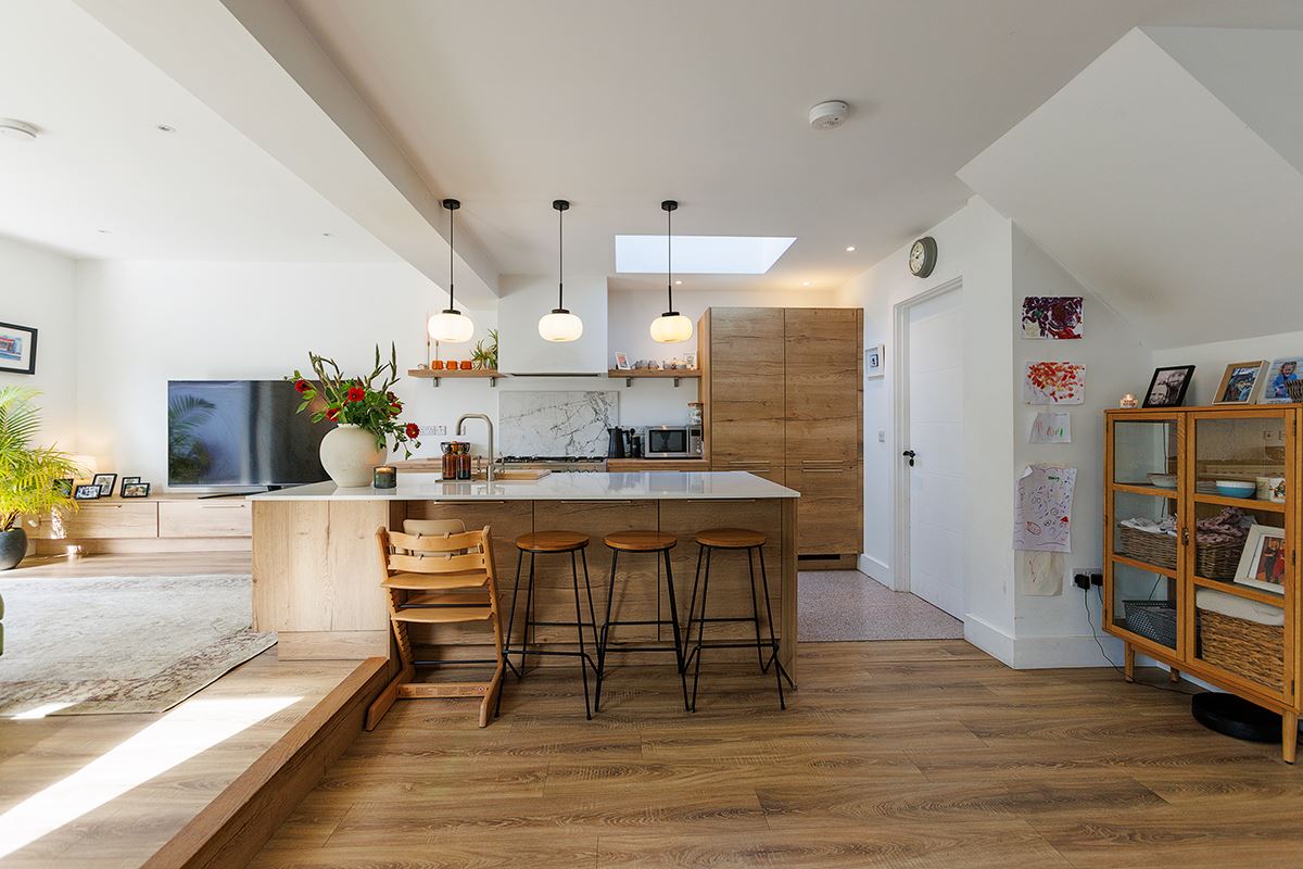 The symmetry and warmth of this open plan space with its vibrant pops of colour, vertical radiators, sleek uPVC black-framed windows, natural wood bespoke cabinetry with horizontal handles, a large central island and integrated seating provided by stylish bar stools, help to create a distinct yet connected living areas downstairs. For moments of quiet escape, a separate lounge to the front of the home mirrors the same impeccable style, offering a cosy retreat.