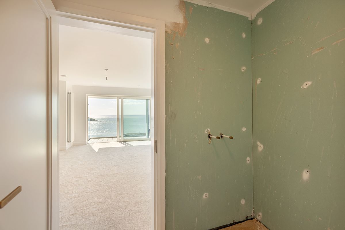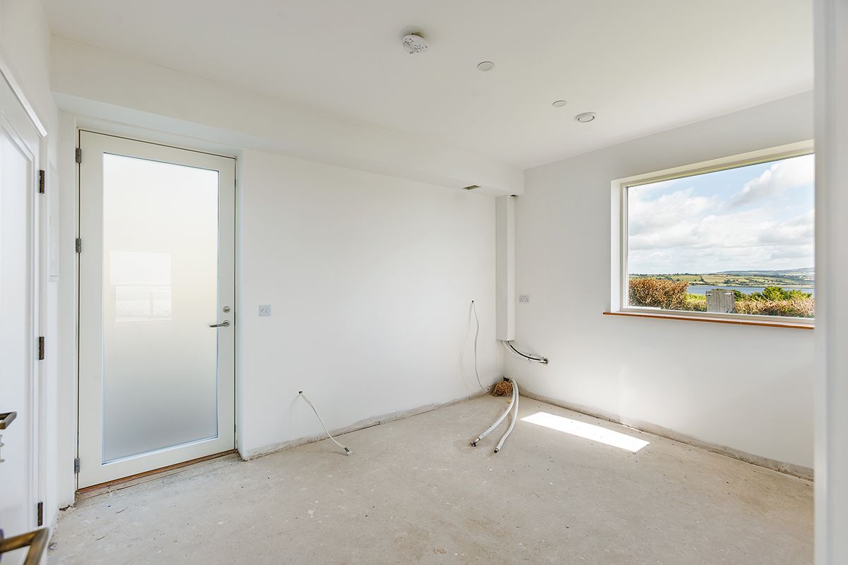 The property welcomes you with a spacious entrance lobby, leading into a truly spectacular, light-filled open-plan kitchen, living and dining space where breathtaking, uninterrupted sea views take centre stage. Floor-to-ceiling windows and large sliding glass doors frame the ever-changing coastline, flooding the interior with natural light from dawn to dusk while seamlessly connecting the indoors to the outdoors. These sliding doors open directly onto an outdoor dining area, creating the perfect setting for alfresco dining, entertaining, and soaking in the coastal views. A separate utility room is thoughtfully positioned off the kitchen, while a guest WC off the hallway completes the ground floor.