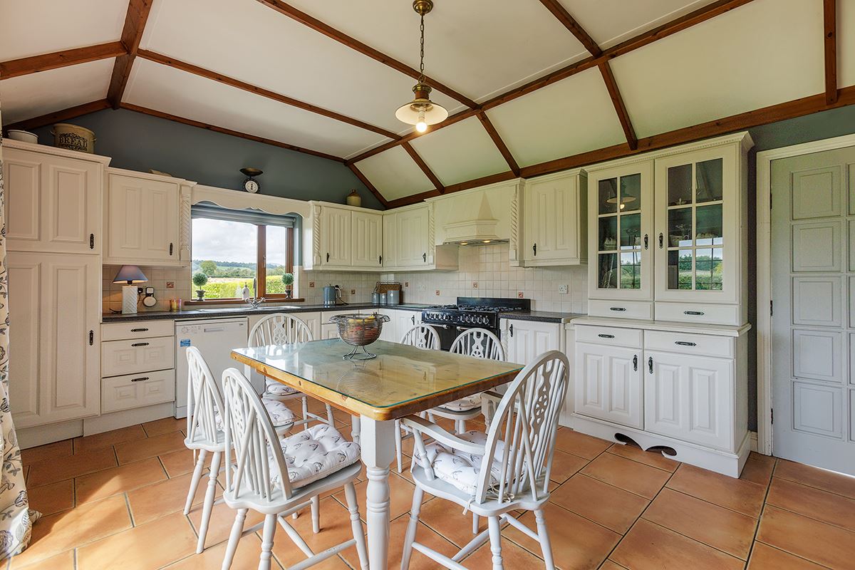 The cottage exudes character, featuring an open plan kitchen/dining room with a vaulted ceiling with exposed beams and double glass doors leading out to the garden, and a cosy living room with open fireplace. Additional spaces include three bedrooms and a family bathroom.