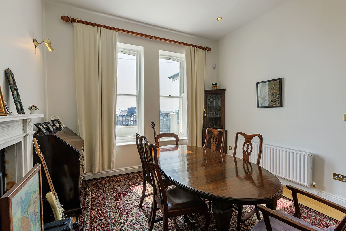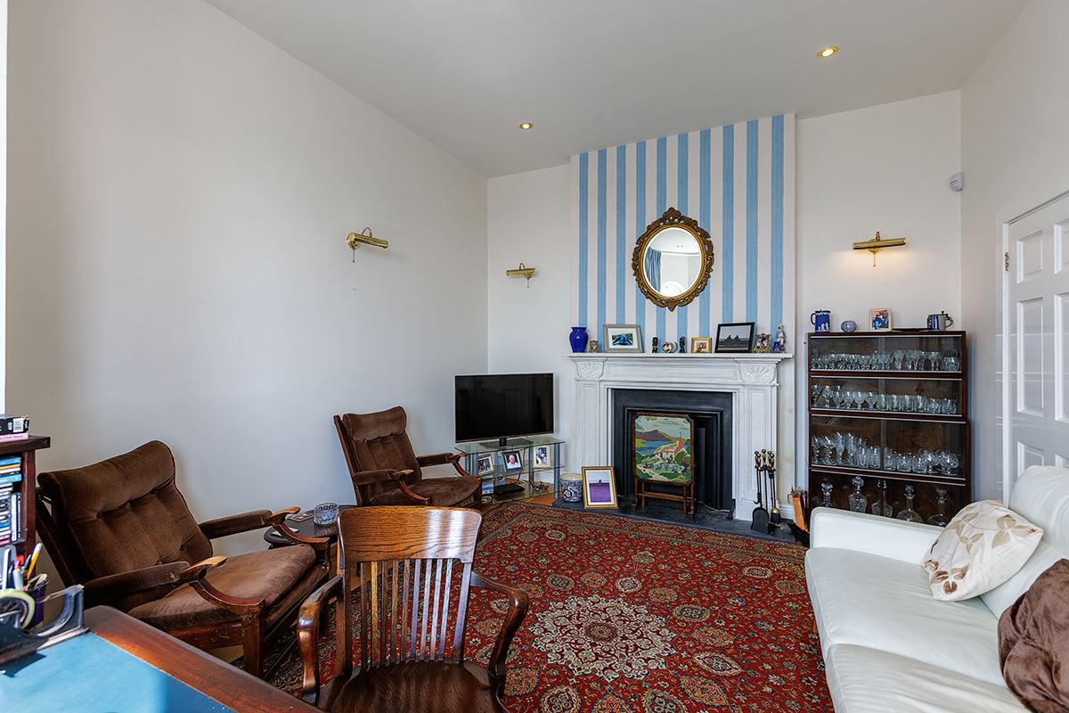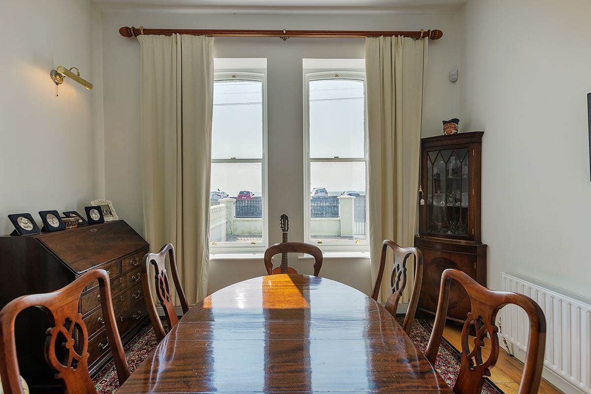 The property opens with an inviting reception hall, where a striking high ceiling sets the tone upon arrival. On the ground floor, the dining room boasts a large bay window that frames stunning sea views and floods the space with natural light. The spacious living room offers a cosy ambiance, complete with a fireplace and stove.