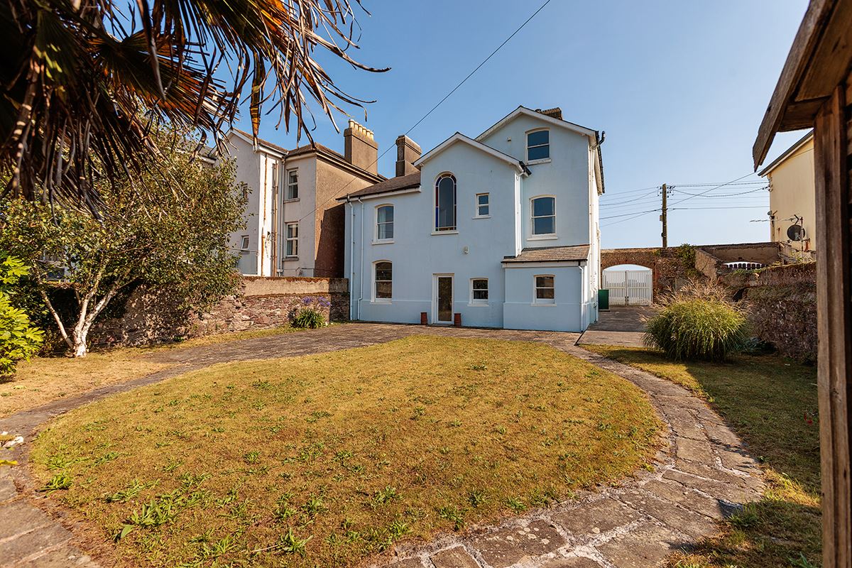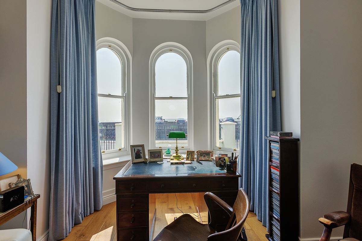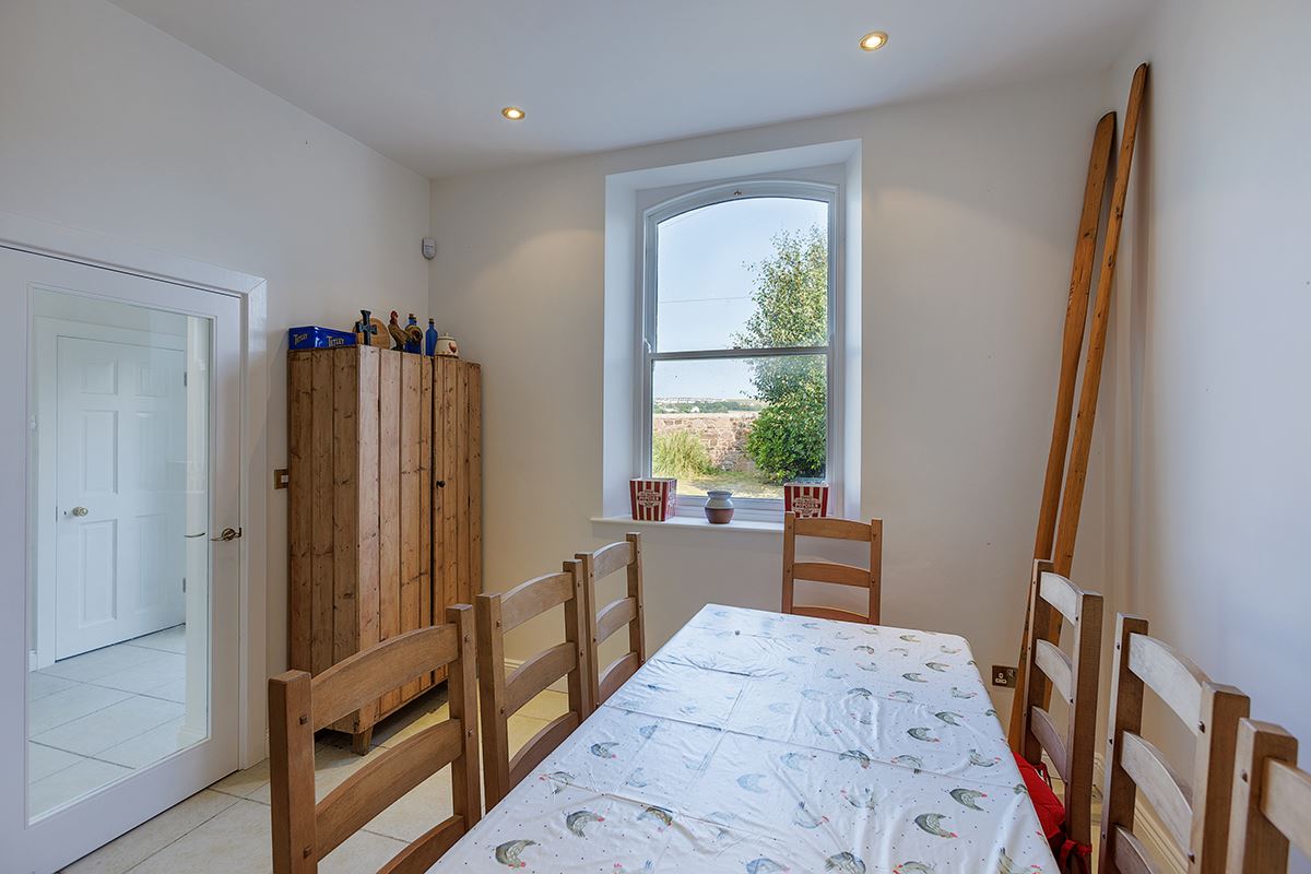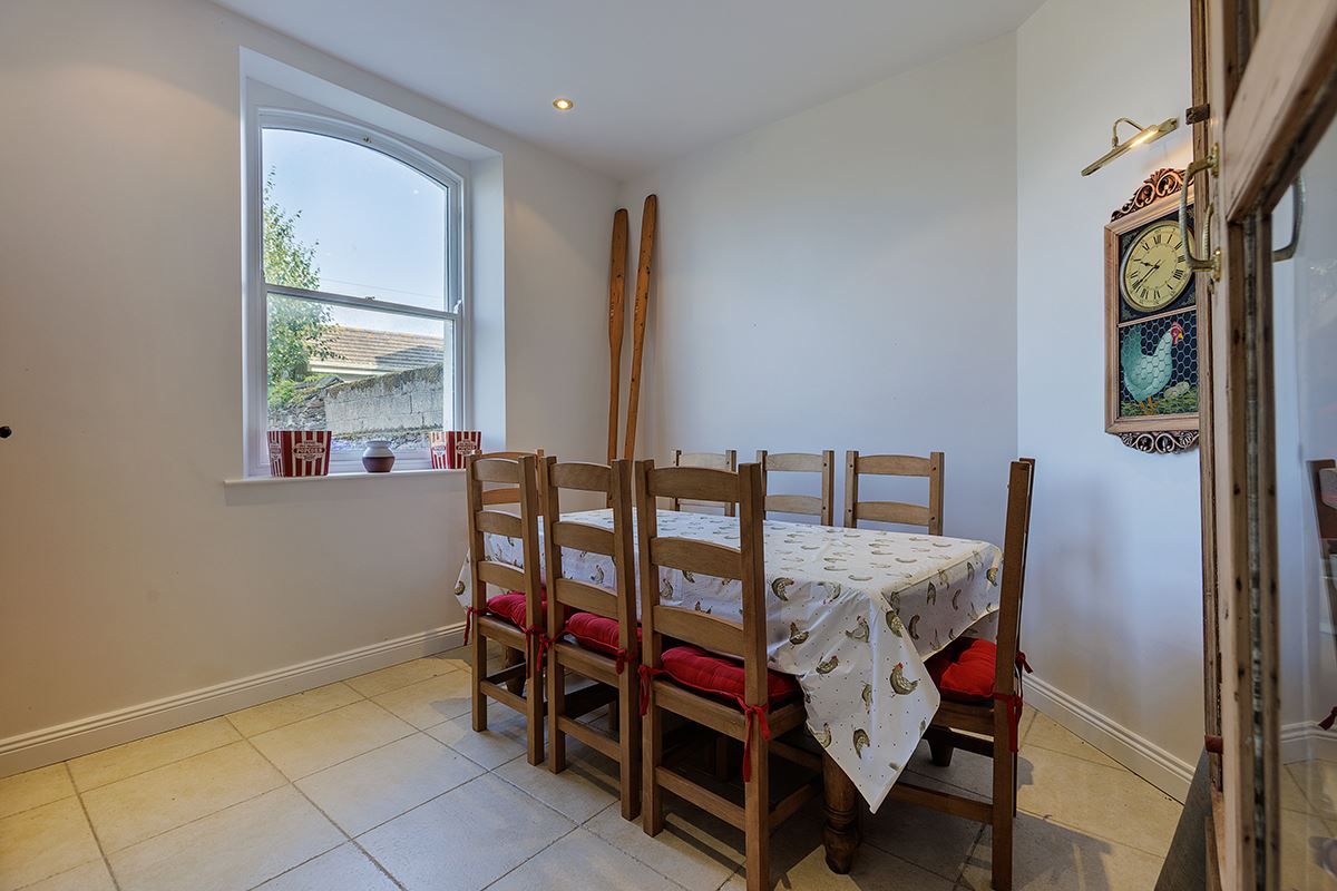 The property opens with an inviting reception hall, where a striking high ceiling sets the tone upon arrival. On the ground floor, the dining room boasts a large bay window that frames stunning sea views and floods the space with natural light. The spacious living room offers a cosy ambiance, complete with a fireplace and stove.